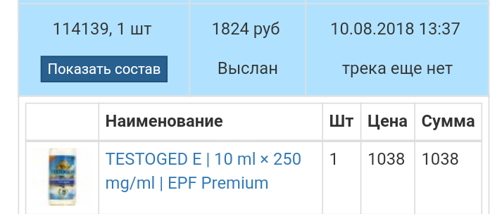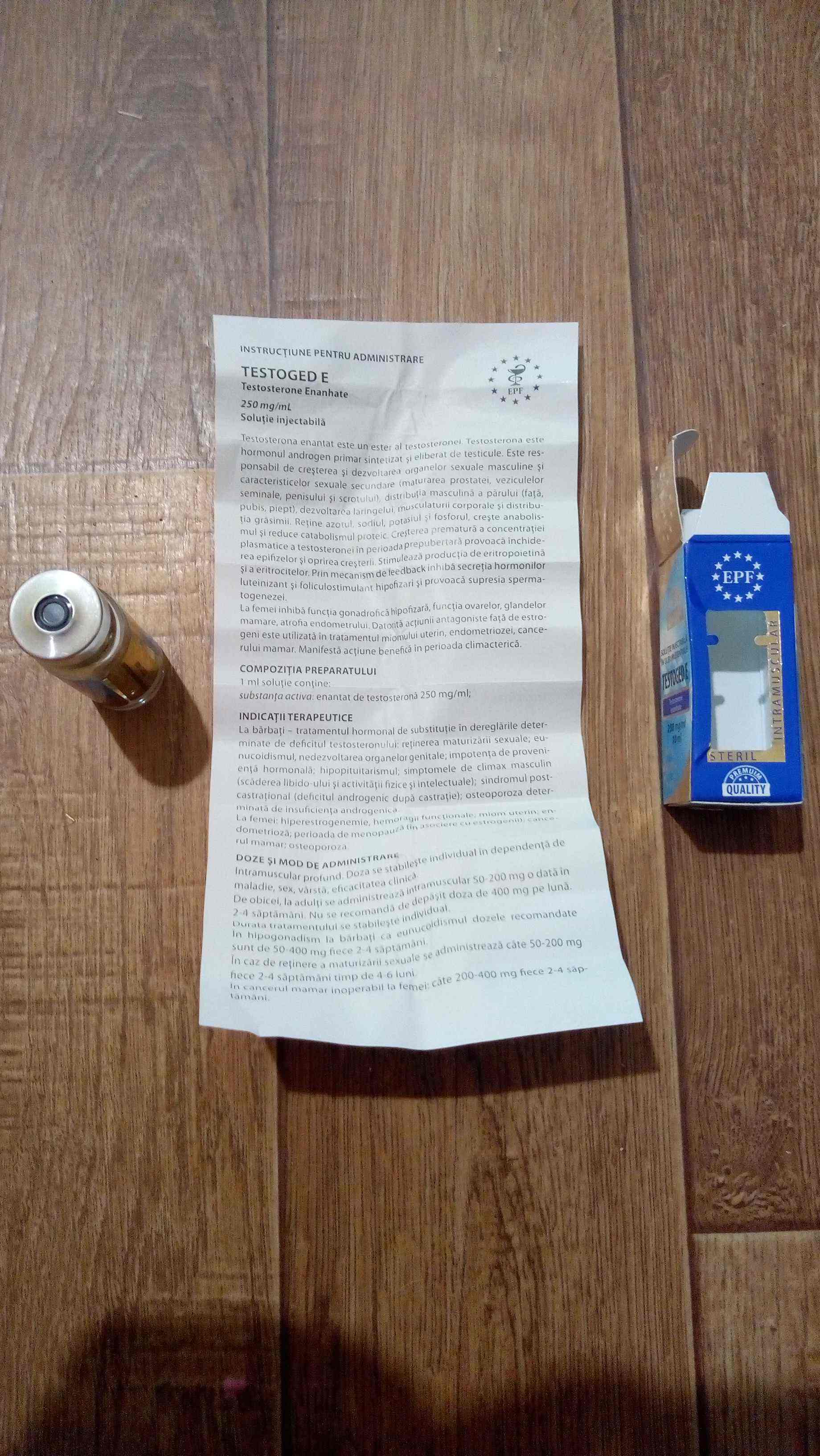 Забрал сегодня посылку с данным препоратом. Сама посылка упакована отлично, много пленки защитной+обернуто в пакет с крупой. С таким количеством упаковки можно в футбол играть посылкой)). Что касаемо упаковки от ЕПФ тоже порадовала, выглядит очень качественно и дорого, легко снимается пластиковая крышка с виалы, не надо ломать металическую защиту это удобно. Поставил сразу куб в плечо. Набирается легко, масло жидкое, не грел. Входит так же ну ура, при введении и в полслдствии никаких болевых ощущений не наблюдается. Прошло пару часов, всё так же без изменений. Следующая иньекция будет через два дня, буду ставить в ягодицу.
