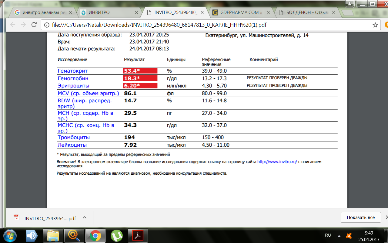 болденон рабочий ! это уж точно , пил и кардиомагнил и всё равно такой результат ... как ещё можно понизить понизить гемотокрит ? состояние капец лажа, мало того отдышка да ещё и вялость сонливость ...